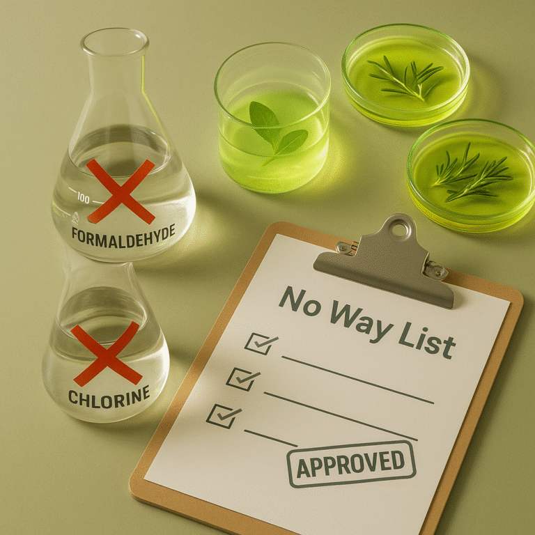 - 50+ banned substances including parabens, phthalates, heavy metals, and synthetic pesticides