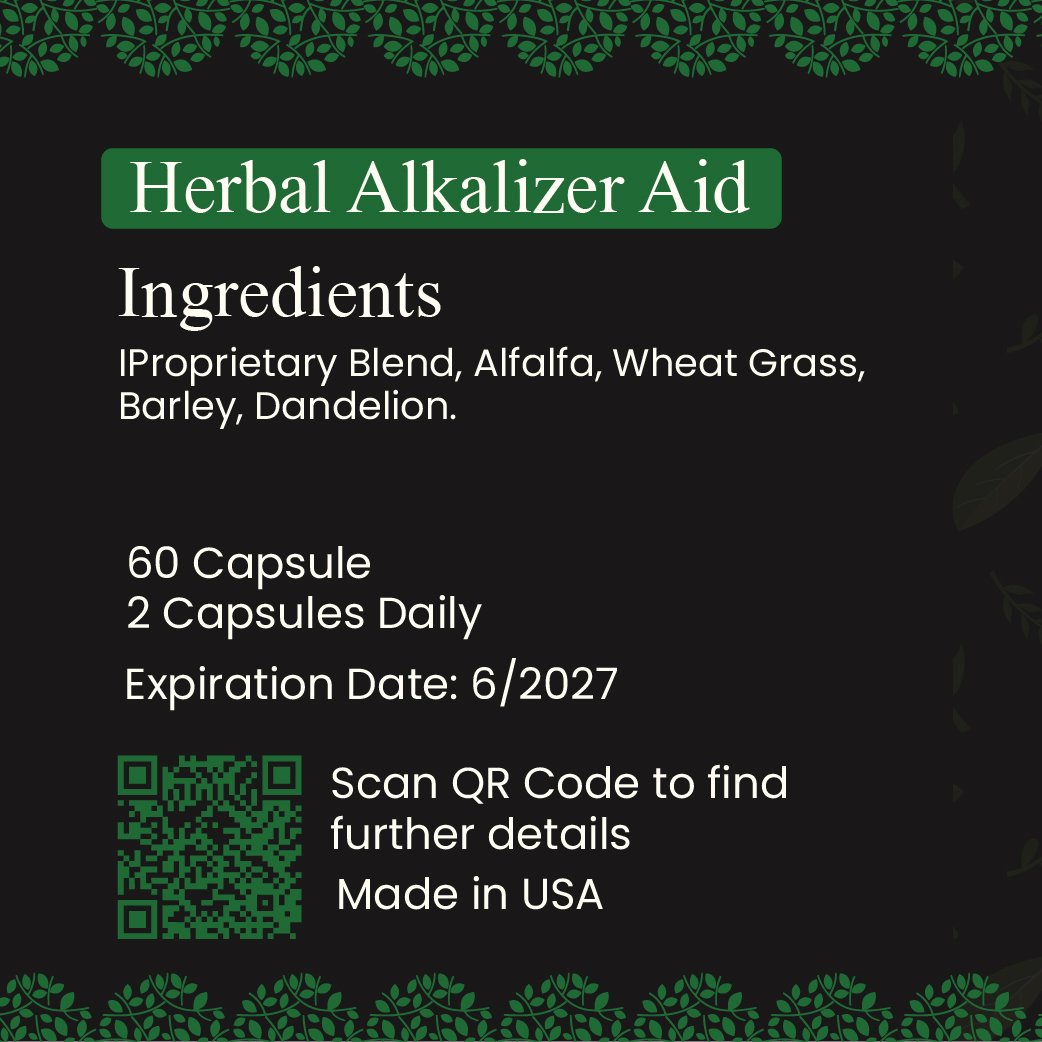 Crafted with a proprietary blend of potent herbs, Herbal Alkalizer Aid combines Alfalfa, Wheat Grass, Barley, and Dandelion to provide comprehensive alkalizing and detoxifying benefits. Alfalfa is rich in chlorophyll and essential nutrients that help purify the blood and reduce acidity. Wheat Grass and Barley contribute vital vitamins and antioxidants that support cellular detoxification and rejuvenation. Dandelion acts as a gentle diuretic, aiding the liver and kidneys in flushing out toxins. Together, these ingredients work synergistically to restore balance, promote healthy digestion, and boost energy levels. Taking two capsules daily as recommended helps maintain a cleaner, more alkaline system, enhancing your body’s natural defense mechanisms and overall vitality.