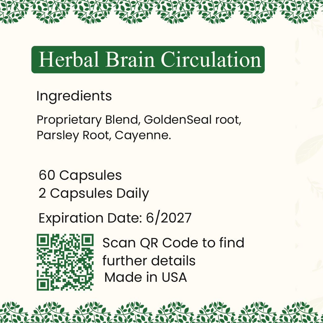 Herbal Brain Circulation capsules feature a potent proprietary blend of Goldenseal Root, Parsley Root, and Cayenne to promote blood flow and oxygen delivery to the brain. This natural formula enhances mental alertness, focus, and cognitive function. Ideal for daily brain support, it helps boost energy, clarity, and overall neurological health naturally.