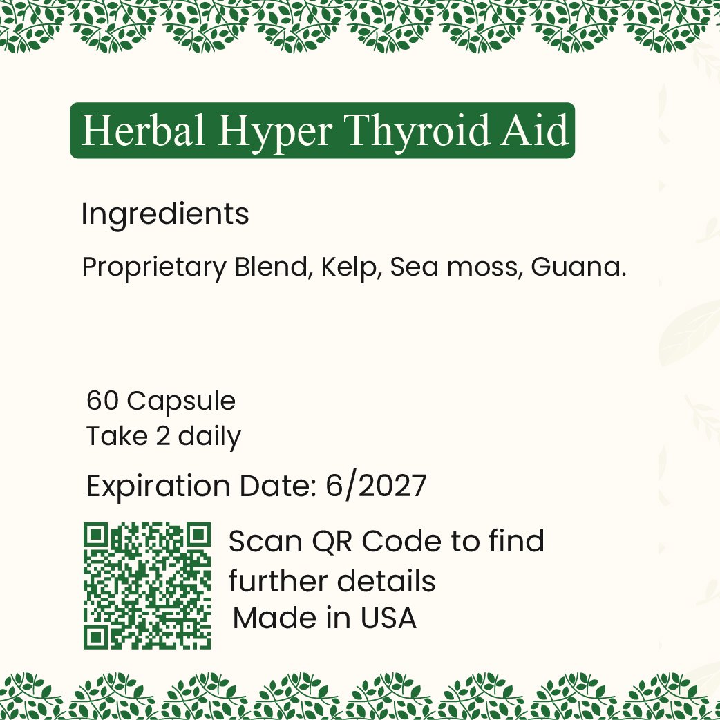 Herbal Hyper Thyroid Aid harnesses the natural power of Kelp, Sea Moss, and Guana in a proprietary blend to support healthy thyroid function. Kelp, rich in iodine, is essential for regulating thyroid hormone production and maintaining balanced gland activity. Sea Moss offers a wide range of minerals and nutrients that promote cellular health and soothe inflammation often associated with thyroid imbalances. Guana, known for its adaptogenic properties, helps the body adapt to stress and supports endocrine balance. Together, these herbs work synergistically to stabilize thyroid hormone levels, reduce overactivity, and alleviate symptoms linked to hyperthyroidism. This natural blend supports your thyroid gently, making it a safe and effective choice for maintaining thyroid health.