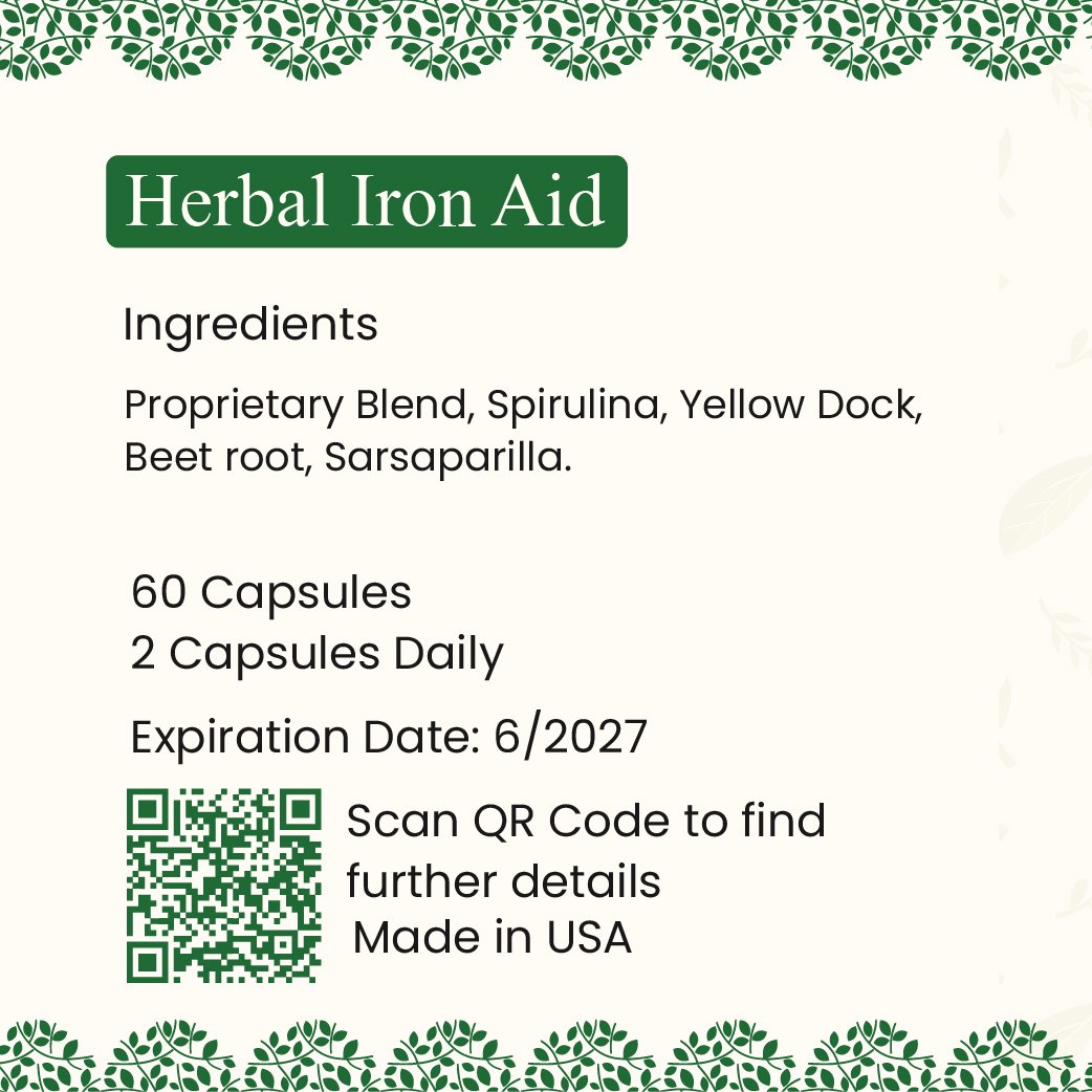 Herbal Iron Aid capsules contain a potent proprietary blend of Spirulina, Yellow Dock, Beet Root, and Sarsaparilla to help rebuild white blood cells and support those with anemia. This natural formula boosts iron levels, enhances blood health, and promotes energy. Ideal for improving vitality, it supports healthy circulation and overall immune system strength naturally.