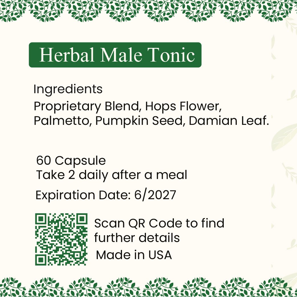 Herbal Male Tonic capsules contain a powerful proprietary blend of Hops Flower, Saw Palmetto, Pumpkin Seed, and Damiana Leaf to boost stamina, testosterone, and energy levels. This natural formula supports male vitality, enhances performance, and promotes hormonal balance. Ideal for daily use, it helps increase endurance, drive, and overall masculine wellness naturally.
