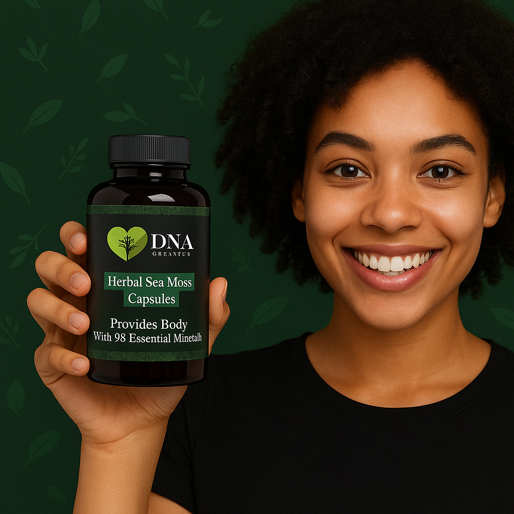 Herbal Sea Moss Capsules by DNA Global Herbs deliver a natural source of 98 essential minerals to support your overall health and wellness. Sea Moss is renowned for its ability to nourish the body with vital nutrients such as iodine, calcium, potassium, and magnesium, which are crucial for maintaining healthy bodily functions. These capsules help promote stronger immunity, improve digestion, support thyroid function, and enhance energy levels. Ideal for those seeking a natural mineral boost, Herbal Sea Moss Capsules provide a convenient and effective way to fill nutritional gaps in your daily diet. With just two capsules daily, you can experience improved vitality and balanced wellness through this potent marine superfood.