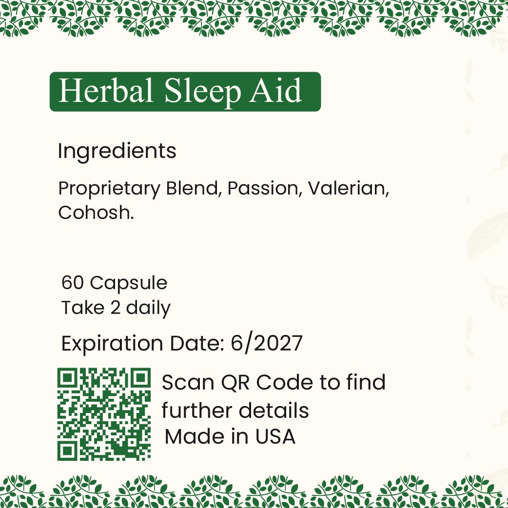 Herbal Sleep Aid capsules contain a proprietary blend of Passionflower, Valerian, and Cohosh to promote restful and deep sleep. This natural formula helps calm the mind, reduce anxiety, and support healthy sleep cycles. Ideal for those struggling with insomnia or restless nights, it provides gentle, effective relief for better sleep and overall relaxation.