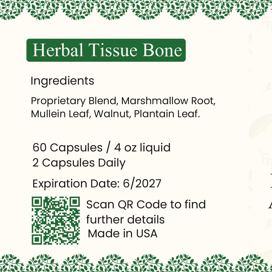 Herbal Tissue Bone capsules and liquid drops are formulated with a proprietary blend of Marshmallow Root, Mullein Leaf, Walnut, and Plantain Leaf to help rebuild bones, tissues, and cartilage. Ideal for recovery after injury or surgery, this natural formula supports healing, strengthens the musculoskeletal system, and promotes long-term joint and tissue health.